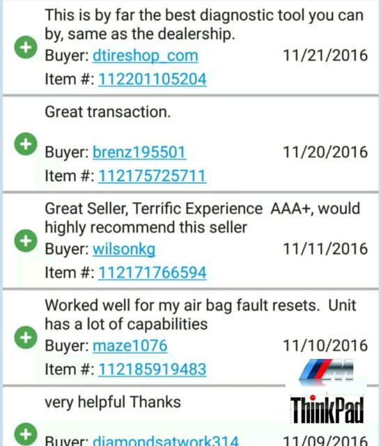 ATTN!NEW! for our 2017 systems our blaze orange thinkpad now has FULLBMW/MINI diagnostics and programming with dealer access! imported parts from GERMANY and built, programme, set up and shipped from USA! What's included on this dealer system? everything you need for BMW/MINI dealer diagnostics coding and programming and parts catalogs! BMW's1# RULE!DO NOTrunsoftware on a everything/daily laptop you use for apps photos music ect or risk errors and problems running programs and or damaging your PC and or irreversible damageto your BMW/MINImodules! this dealer system is engineered to RUN full dealer diagnostics on aDEDICATEDdealerLenovo ThinkPad, That'sONLYused for that purpose! BMW Owners Manuals BMW ETM (Electronic Troubleshoot Manual) BMW KSD 2017(Error Code Catalogue & Labour Calculator) BMW EBA 2017 (Retrofit Options Installation Guide) NFS WINKFP 5.3.1 (Latest Datens) iTool Radar Version 2017 BMW WDS 2017- BMW Wiring Diagrams MINI WDS 2017 - MINI Wiring Diagrams BMW ETK 2017 (Electronic Parts Catalogue) Q: Why the investment? IISTA/P programming 2017 BMW ESYS 2017(BMW Dealer coding and programming tool) INPA 2017 & NCSExpert 2017 (advanced text-based diagnostic used at BMW dealerships) Built by a 9 year BMW specialist!Afull instruction/walkthrough guide and PDFs is included to walk you throughstepby stepusingyour BMW diagnostic/programming system and ALL its features! Additional information: - all OBD2cables are tested before shipping! -Included inpackage is a complete laptop ThinkPad system engineered for BMWdiagnosis w/ charger and tested OBD2 Cable - Programs don't require special skills! out the box and ready to go! fully programmed, tested and engineered system that properly built by aBMW9 year programming professional!The exclusivepaint on your diagnostics laptop is designed as aprotective coating that protects the laptop frommechanic grease, tools, and wearto give you years of protection from harsh elements like in garagesThis is built, engineered and customized for quality, performance and protection!inUSA! and NOTHING LIKE IT ONLINE! eBaYEXCLUSIVE!!@ONLY$399.00!Shipped! w/ FREE priority 2 day ship tracking with insurance! (please allow 24-48 to prepare shipment)*LIMITED QUANTITY* 1 PER CUSTOMER!whilesystems last! - All models1996-2017!are covered with a M Thinkpad! Features: •Fault Code Reading / Resetting •Auto Identify your vehicle number, Chassis, ECU etc •Code / Program modules •Service Light Resetting •Annual Inspection Reset •Read / Clear / Reset Air bag Light codes •Read / Clear / Reset ABS Light codes •Apply Firmware & Software updates to your BMW •ABS Wheel Speed Sensor checking •Real Time Diagnosis and Display Data •Full Diagnostics •Test specific parts •Live Data Checking •Creation of Test Plans for Repairs/Upgrades/Updates •EWS DMW Synchronisation •Apply Firmware & Software updates to your BMW •Read/Clear/Reset Fault codes and faults •Programming of vehicle functions (inc retrofitting of items) •Coding of vehicle functions •Monitor information •Key Memory and Personalising •Key Matching and Remote Control Programming •Car Memory Setup Features •Reset Adaptations •Individual Values •Alignment •Activation •Module Version •Reset SMG / SSG Functions This is just some of the things you can do with this dealer package! I've dedicated my life to building and engineering from the ground up a solid and true BMW/MINI diagnostics/programming package and solving a worldwide problem for BMW enthusiasts, owners and independent garages! My reputation and your positive word of mouth means everything to my success and your support is tremendously appreciated! Shawn T. BMW SPECIALIST |