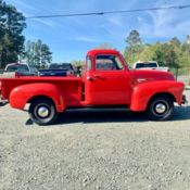 Body: Single Stage, original color Mariner Blue. There's some buffing areas I missed (slight haze here are there), and a few areas that have slight trash in the paint. One small rock chip that I had to brush touch up on the passenger side rear fender, but it's pretty low and not overly obvious. I'm probably being over critical, but that's just how it is and I drive the truck, I didn't set out to make it a trailer queen. Are you going to win the Ridler award for best paint? If there's no other cars entered, then yes. I don't think you'll be embarrassed by it, but understand it's not perfect. Fender mounted spare tire. Solid Red Oak bed, custom red oak side wood. All new chrome emblems, bumpers, new glass all around. LED turn signals and brake lights. "Aoogah" horn, electric wiper conversion. AM/FM/I-Pod/Aux Retrosound radio. Original cowl antenna mounted behind the cab. Main Floor mat and individual mats (no carpet). Original interior panels (cardboard).