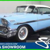 For sale in our Tampa showroom is a one of a kind 1958 Chevrolet Biscayne. This cool custom is a real wolf in sheeps clothing. The gear driven 350 cubic inch Chevrolet small block V8 that sits under the hood runs like a champ and sounds even better! The engine is slightly built with: Edelbrock Performer air intake power steering and air conditioning. The engine compartment is super clean outfitted with various accessories including: Optima battery polished valve covers polished A/C compressor braided lines polished pulleys and an aluminum radiator with a Flex-a-lite electric fan. This 58 Chevy for sale is backed by a street happy 350 turbo automatic transmission that shifts through the gears with ease. Its topped with a B&M Quicksilver shifter. The power is sent to the rear which is a: Shortened four linked Ford 9-inch differential rear end. This comfy cruiser handles well and stops like a dream via four wheel disc brakes with a hydroboost power brake booster. Moving from the engine bay to the interior you see how nicely its finished. With two-tone grey cloth interior its subtle yet muscular. From the bucket seats to the dash to the headliner its easy to see how well built this vehicle is. The dash is of original styling with: a tachometer Hurricane underdash A/C system tilt steering wheel full Painless wiring harness Impala steering wheel and a three gauge pod added. The modern but original style radio is supported by Kenwood speakers. The trunk is also fully carpeted looking just as nice as the interior. In the trunk youll find the fuel cell which is set-up nicely and keeps this 58 Biscayne for sale fully fed. Stepping away from the 58 Impala look alike you can get a full grasp of its beauty. The straight body curvy lines loads of chrome and stainless steel and Purple Haze Metallic paint make this car stand out amongst the others that surround it. The Purple people eater look highly compliments the styling of the vehicle and give it a subtle street rod vibe. If the paint doesnt do it for you the Billet Specialties wheels wrapped in radial tires surely will. The rear has been tubbed and is supported with hefty meats making this pro-touring styled hot rod look like its ready to hit the track! This 1958 Chevy for sale is a car that grabs attention from racers rodders artists and vintage lovers alike. It has the right amount of everything to truly accent the pure beauty of the 58 Chevys. Options include: A/C AM/FM radio with cassette and CD player power brakes power steering tilt wheel and aluminum alloy racing wheels with radial tires. This 1958 Chevy Biscayne for sale can be seen at our Tampa showroom. To see more HD pictures and video please visit our website . For more information please call the Tampa showroom at 813-645-6200.