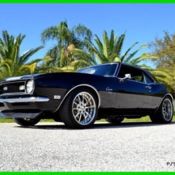 You can call this 1968 Chevrolet Camaro RS pro touring or a resto mod...Labels don't matter when you play at this premium level of fuel-injected V8 power, modern upgrades, and the slickest custom you're ever going to see. Before we let you admire the paint, take a moment to look over the body. It seems a bit more modern than other first-gen Camaros you see, right? That's because they really sweated the details. Drip rails were eliminated, sport mirrors were added, the windshield and rear glass was flush-mounted, and the fenders were delicately flared to accommodate the 10-spoke US Mags wheels. It was all to make sure this had the most seamless appearance of any '68 you've ever seen. Even the iconic full-width spoiler was custom-built into the design. It's one sleek machine, and so it deserves a butter-smooth paint job. That's why the modern red went on with such a professional had that you'll swear this coupe is candy-coated. And because there's less than 50 miles on the whole build, you really get to enjoy the investments made. But while this red looks aggressive, you'll also love this coupe's darker side. You see it in the custom grille with the Rally Sport's hidden headlights, low front air dam, blacked-out rear panel, and the custom cowl hood with a power bulge that's highlighted in black. It's a total package that's both slick and intimidating all in the first glance. Inside, one of the first things you'll notice are the seats. You instantly recognize these as modern performance seats with modern bolstering. This is not only for you, but also all passengers - front and rear. The black leather is supple, and the red stitching is the kind of detail that you expect from a top-quality build like this. Plus, everyone gets a nice center console with welcomed cup holders in between. When your arm is not resting on the padded console, it will instantly be attracted to the Clayton shifter. Just ahead of that is an AM/FM/CD stereo with modern USB and Bluetooth connections. Plus, there's more great luxury items like modern R-134a air conditioning, power windows, power locks, power steering, and a push-button start. But more than just a coddler, this is a true performance machine. You slip behind a NRG sports steering wheel mounted on an Ididit tilt steering column. Beyond that is a large AutoMeter speedo and tach, and to the side is a full auxiliary gauge trio. All this lets you know there's something serious under the hood even before you fire it up and hear it roar. While many motors are chromed, this modern classic goes for the full blackout treatment in the very tidy engine bay. This includes great modern touches like the carbon fiber air topper and matching valve covers. More than just look modern, this 383 cubic-inch stroker V8 features modern performance pieces like the MSD Atomic electronic fuel injection, MSD ignition, and serpentine belt system. Other great upgrades include 3.75 steel crank, 10:1 compression, Pro-Comp CNC aluminum heads, Comp Cams 280 CFI roller camshaft, and Edelbrock Air Gap intake. Plus, Hedman shorty headers add even more power as they also contribute to the rumble of the Pypes X-pipe dual exhaust. The enhanced V8 is mated to a TKO 600 five-speed manual to give you full control over the big power and its thunderous soundtrack. This connects to a stout Strange S60 rear end with limited-slip and 3.73 ratio for great takeoffs. And more than just getting off the line, this one is an all-around performer with suspension upgrades like a Ridetech front subframe with tubular A-arms and adjustable coilovers. The rear is upgraded to a four-link with adjustable coilovers. Plus, you've got the superior control with the large full Wilwood four-wheel disc brake package and ultra-grippy (and expensive) Michelin Pilot Super Sport tires. This is the prestige of a first-generation Camaro in a street-eating package that has the kind of comfort and control to leave you wanting for nothing. It's a thorough custom build, and we have the receipts to prove it. Here's a vintage muscle car that does everything, including leave our showroom quickly, so you better call today!