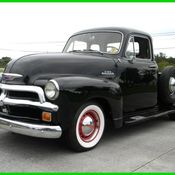 You're looking at a classic truck done right. This 1954 Chevrolet 3100 5 Window pickup has really paid attention to details to be an all-around stunner. So take some time to look over all of this one, because you won't be disappointed. Chevrolet's Advance Design era were great-looking trucks, but there are a select few that are a bit more distinctive. 1954 brought its only major design change with the distinct front end â€" something that was only available for a year and a half over this truck's long run. And we bet you love the look of the ultra-desirable five-window cab. But there's much more here that will have you hooked. The black paint has a deep gloss that looks terrific as the sunlight rolls over the smooth body panels. The detail work is terrific with the bold hood ornament, real wood truck bed, and side-mounted spare tire complete with whitewalls. And speaking of the wheels, have you noticed how the red steelies match the red pinstripe painted around the cab? See what we mean about a thoughtful package. The tan interior against the glossy black exterior is a timelessly attractive color combo. The bench seat, door panels, and dash all look terrific. And they even discreetly upgraded the radio to an AM/FM receiver. So you'll love getting behind that classic steering wheel and going for a drive. And when you do, you'll notice this classic has a little extra spring in its step. Under the hood this truck continues its theme of honest showmanship. Chevrolet's sturdy 235 cubic-inch motor looks great with the fresh grey paint and the bold yellow announcing its Thriftmaster heritage. This whole setup is quite clean, tidy, and period-correct, so don't forget to recognize some great upgrades like the 12-volt system with alternator. Plus, we know you've spotted how this motor breathes better. The Fenton intake with twin Rochester single-barrel carburetors were a terrific way to add some power back in the day. And the split manifold gives this inline-six a true dual exhaust. Best of all, you control it all with the fun column-mounted three-speed manual transmission. This truck is tidy from every angle (including the undercarriage.) And it drives as good as it looks! So if you've been waiting for an Advance Design stunner, don't let this one slip away. Call today!!!