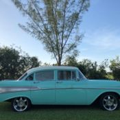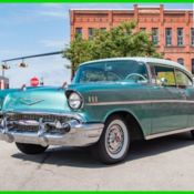 The 1957 Chevrolet Bel Air two-door sedan is already in-demand because it's iconic. But to take it to the next level like this one, you need bold paint, serious V8 power, and an exceptionally fresh presentation that has less than 1,000 miles on it since the full frame-off restoration. So this is a custom and thoughtful build that shows us what happens when someone invests in quality. The glowing turquoise is the exact right color for this classic. There were hues like this available from the factory, but this modern clearcoat finish is far bolder... and that sets the theme correctly for this Chevy. It has an excellent glow that rolls evenly in the sunshine, which tells you there was the right kind of investment in getting this modern sunny color applied correctly. Plus, the white roof adds to this car's period-correct appeal. And of course, there's the brightwork. It all has a mirror-like shine that takes this Bel Air back to day one. More than just bright, there was a solid investment in the body. That means everything looks nearly seamless â€" from how the hood rests into the grille to the full-length trim line that helps form the iconic tailfin. But more than just aesthetics, this one gets its fundamentals right, too â€" the glass is clean and clear; the lights are bright; and the doors shut with authority. So it's a cool cruiser with an anytime driving attitude. The turquoise theme continues inside as the fresh interior showcases the ideal mix of vintage and new. For example, the seats follow a similar pattern to the classic Bel Air, but now these custom benches are given individual bolstering for all-day comfort. These seats nicely match the door panels and dash for a very uniform appearance. As you look over the whole interior all the upgrades seem to be done with careful thought. The cup holder center console nicely matches the carpeting. The chrome Ididit tilt steering column and upgraded sports steering wheel have the kind of shine that nicely fits with '50s nostalgia. The original gauge housings now have Dakota Digital VHX readouts to give you more complete info. And while the radio looks like a vintage knob-style unit, it's really a digital tuner that offers modern amenities like USB inputs and full Bluetooth capabilities. And if all of this didn't already have you convinced this is a cool cruiser, there's even modern R134a air conditioning! Grab your sunglasses before opening the hood, because we dare you to find another component that can be polished. There has been a huge investment in time and money for such a tidy and shiny presentation. So we bet the engine bay will win awards all on its own. And since this car is fresh off of restoration, the motor really is as fresh as it looks! This 350 cubic-inch crate V8 has much more going for it than just the shine. Behind the style is the substance of performance upgrades like a large Edelbrock 750 CFM four-barrel carburetor, Edelbrock intake, and shorty headers. This full package is estimated to make 325 horsepower, and the growl of the X-pipe dual exhaust lets everyone know it. But more than just powerful, this was built to reinforce its easy cruising attitude, too. That's why you have features like the aluminum radiator w/electric fan to keep it all running cool even if you're in traffic with the A/C pumping. The full Jim Meyers front suspension gives this a solid feeling on the road, and the Wilwood four-wheel disc brake package gives you superior stopping power. Plus, the four-speed automatic transmission w/overdrive, power steering, and cruise control make this a terrific highway classic. This is an amazing build, and you can take others on this icon's transformation thanks to the full paperwork file. It includes a full restoration photos book, full manuals for the upgraded components, and binder with itemized receipts documenting the huge investment in the Chevy. It's everything you want in one iconic design. So hurry before someone else grabs your dream Bel Air. Call today!!!