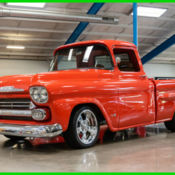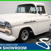 This 1958 Chevrolet 3100 Apache has a terrific mix of new and vintage. After all, the classic face is joined by a modern truck bed, A/C interior, enhanced V8 power and much more to create a very cool custom pickup. This is a thoughtfully assembled total package. The Apache design was only in place for a couple of years, so it has a distinctive place in all out truck-loving hearts. That's why it's great to get the front end looking straight and presented so well. But you'll begin to notice some subtle custom work. For example, the bumper is painted to match the white body, and the grille has a tasteful tan that coordinates with what's wrapping around the rear of the cab. So you get a classic look that's tastefully distinct. And speaking of distinction, a newer-generation strepside bed was added to the truck. With matching paint and classic polished bedrails, this feels like a seamless integration. Plus, the American Racing Torq Thrust wheels add extra shine while also drawing attention to the aggressive forward-leaning stance. Inside is more great custom work. The tweed on the seats nicely coordinates with the lower door panels, carpeting, and custom center console. The full uniform package is complete with the doors and dash following the two-tone theme from the exterior. More than just look great, this truck was upgraded for comfort. The two low-back bucket seats provide a much more individualized bolstering than the factory ever could in '58. Plus, you get an AM/FM/CD stereo and ice-cold air conditioning. The upgraded NK4 steering wheel feels grippy in your hands, and the full AutoMeter gauge panel is another reminder of a nice upgrade under the hood. Since the interior and exterior were meant to show off, the engine bay is, too. It's exterior-matching tan paint and smooth appearance really funnels your attention to the V8. The motor is finished nicely with plenty of polished components, and its overall tidy appearance reaffirms this was a well-done project. The 350 cubic-inch motor inhales deeply thanks to a Holley four-barrel carburetor and aluminum intake. And it stays cool thanks to dual electric fans. And while you'll like the rumble of the dual exhaust, don't forget to follow its path in the undercarriage photos. There you'll not only spot a nicely painted chassis, but also great driving upgrades like the Camaro front suspension and front disc brakes. Add in power steering and a four-speed automatic transmission w/highway-friendly overdrive, and this is a fantastic anytime custom pickup. This is the classic Apache that's an absolutely memorable custom build. So if you like to stand out in all the best ways, call today!