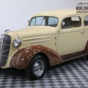 This 1936 Chevrolet pickup proves that good taste never goes out of fashion. Restored to include V8 power, an updated suspension, an A/C interior, and the right amount of flair, this is the pickup that will turn heads. Vintage pickups are all about getting in touch with the satisfaction of a hard day's work. But when it has been hot rodded like this Chevy, it's all about the hard work that went into making it a great looking custom. The total package strikes the right mix of vintage appearance and new style. And it's perfectly seen where the all steel body of the tall, upright cab meets the amazing shine of the paint. They took their time applying the Candy Apple Red and plenty of clearcoat, so you really get to see the sunlight highlight the creases in the sheetmetal and the gentle fender curves. And it wouldn't be a true custom without some brightwork. The tall waterfall grille, headlight surrounds, door handles, and bumpers all have a mirror-like shine. But the details you'll really enjoy are likely the classic pieces like the glossy oak in the truck bed and the classic style cream wheels (they mask the more aggressive tread of the tires.) Inside you see more modern upgrades that still leave room for classic flair. The seats are a great example. These modern buckets look terrific in tan leather, and with less than 4,600 miles on the whole build, there's barely a crease in them. Plus, they leave room for a vintage tweed that looks great and feels comfortable. This same leather and tweed is continued on the custom door panels, around the cab, and on the headliner for a full uniform feeling. Plus, with the exterior red returning on the dash, this really has a very thoughtful total presentation. We love how they left the crank in the dash to tilt the front windshield and remind you how they got their breezes back in '36. But now this modern street machine keeps you cool with modern R134a air conditioning. There's even an AM/FM/CD stereo that's nicely hidden so that you can get modern tunes in this vintage ride. But as you slip behind the wood and chrome steering wheel, grab the Lokar shifter, and gaze over the full VDO gauge package, you instantly know there has been some nice upgrades in the engine bay, too. While the butterfly hood will draw plenty of attention, there's also plenty to show off underneath it. The 400 cubic-inch small block V8 looks tidy and has plenty of shine from the polished air topper, valve covers, alternator, compressor, and much more. But more than just looking good, this large small block has the added power of an Edelbrock four-barrel carburetor, Holley performance intake, and the throaty rhythm of the dual exhaust fed by shorty headers. But don't just listen to the pipes; look at their full journey in the undercarriage photos. There you'll see how thorough the build is because even the frame shines from Candy Apple Red. Plus, you'll also spot an upgraded independent front end with tubular arms and adjustable coilovers. Add in great anytime features such as the TH400 three-speed automatic transmission, power steering, and front disc brakes, which all makes this a great looking pickup that's easy to drive anywhere. You looked through all the photos. You've seen how tidy this truck is, even in the undercarriage. It's a truly interesting and nicely restored Chevy pickup that will get people talking because of its high quality and gorgeous execution. If you're ready to be the toast of the show give us a call today!