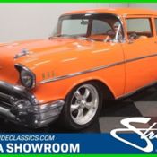 Dazzling in bright orange metallic paint with a powerful and reliable 350 V8 under the hood, this 1957 Chevrolet Bel Air has been built to show, yet drives like a modern muscle car. Tastefully modified, it retains all the styling cues that make the '57s so iconic, but done to standards they just couldn't have imagined when it was built. You can see from the reflections in our photo booth that there are no ripples or waves in the panels, even the big ones like the doors and quarters. Gaps are excellent, and there's something about the way the doors close on cars of this vintage that you can't find anywhere today. It's a solid, precise feeling that suggests the engineers were at the top of their game when they designed these cars. And that orange paint practically vibrates in the sun it's so bright. With that lowered stance, it almost looks chopped or sectioned, but I assure you that it's 100% as the General intended; it's just the awesome workmanship that makes it look so incredible. All the chrome and stainless is in good shape, too, from the big grille with chrome "Dagmars" to the beautifully polished stainless on the flanks and around the windows. It's got some age on it, but nothing serious and nobody will ever notice the little flaws simply because the overall effect is so jaw-dropping. The interior more than lives up to the promises made by the body. Although it looks totally custom, those are factory seat frames wrapped in custom vinyl and cloth upholstery that neatly disguises the factory stuff, and like the paint, it has been done to an extremely high standard. The door panels have been upholstered to match the seats and everything else was painted to match the bodywork. The original dashboard has been retained and restored, and even the modern AM/FM/cassette radio looks like the 1957 version. A tilt steering column was cleverly added and painted to hide in plain sight, and the custom steering wheel is simply beautiful. Other features include heat and A/C (needs to be serviced), power windows, and a nicely finished trunk that looks just as trick as the rest of the interior. Power comes from a 350 cubic inch crate motor that looks right at home in the Bel Air's engine bay. That billet air filter feeds a Carter 4-barrel carb, and the aluminum valve covers sit atop a set of center-bolt heads. All the power accessories you'd expect are included, from the A/C to the power steering and 4-wheel power disc brakes, making this a car that is daily-driver reliable and show car beautiful. Underneath, the chassis is nicely finished in black with gray floors, with a big front sway bar, a 700R4 4-speed automatic transmission, and a 10-bolt rear end hanging on leaf springs. A custom-made dual exhaust system gives it just the right rumble, and traditional American Racing Torque Thrust wheels carry staggered 215/50/17 front and 255/45/17 rear performance radials. This is an exceptional '57 with a build that could not possibly be duplicated for the asking price. Best of all, it's a no-compromises car that is reliable enough to drive every day and beautiful enough to take home trophies. Call today!