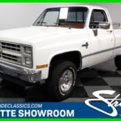 With trucks becoming more car-like every day, there's starting to be a real call for the classic real-deal pickups like this 1986 Chevrolet K-10 Silverado. This 4x4 has the great no-nonsense looks, and the investments made in this one went to enhance the robustness just as much as the beauty. The Silverado was the premium trim of the truck line, and so it looks quite nice in a bright white. This premium attitude is heightened by the big chrome bumper, wide grille with color-matched strip, and full side trim. But don't accuse this pickup of being a pretty boy. They paid special attention to make sure that the upgrades were equal parts flash and function. For example, the rear step bumper, bed side protectors, and Kobalt lockable tool box not only have mirror-like finish, but also diamond plate toughness. Plus, only the best trucks received the 15-inch factory alloys. The red interior is fantastic against the white exterior, especially because this looks like there have been given some fresh investments. It's also a nice place to spend some time thanks to the plush velour-topped seat and sliding rear window. Plus, the driver-oriented setup means a dual-spoke steering wheel that gives you a commanding view of the gauges. It's an easy reach to all your controls, including the upgraded AM/FM/CD stereo and newer Vintage Air system. You've got nice hints of shine under the hood with the bright air topper and the valve covers that announce this as a 350 cubic-inch motor. More than just look attractive, this V8 has extra substance thanks to the Edelbrock four-barrel carburetor and Weiand intake. Not only does this extra power give the dual exhaust extra growl, but you also get extra muscle for when you're enjoying this 4x4 off-road. As you look at the undercarriage photos, the cleanliness of the components tell you there have been the right investments and care so that you can rely on this pickup. This one is really built to be a good truck. The four-speed manual transmission is geared to offer plenty of low-end torque, and the BF Goodrich All-Terrain T/As are great to have when the pavement ends. Plus, power steering and front disc brakes are great anytime features no matter if you're in the high country or Main Street. This is the truck that works hard and plays hard. It gets a lot more attention than a new 4x4, and it even still comes with all the right truck features. So don't miss out, call today!