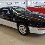 This 1993 Chevrolet Camaro Z28 Pace Car is a rare find on a number of counts. It's well equipped for inspired driving, sports a look all its own - with a very eye-catching two-tone paint job - and has been lightly driven, with only 39k miles logged. With only a very limited number of Z28s in pace car configuration having been made, this one boasts some genuine collectible value, as well. You don't need more than a quick glance to see this is one uncommon Z28. The black and white exterior - with a white foundation extending to just below the height of the tires before transitioning into jet black above - combines with a series of intertwined, colored stripes on its rear flanks and official Indianapolis 500 pace car decals on its doors and front fenders to proclaim its distinctive, racing-inspired lineage. Unlike a lot of cars that feature convertible or removal tops, this is one that retains its visual impact both with its T-tops in place or in open air configuration. 1993 heralded the arrival of the fourth generation of Camaros, and Chevy marked the occasion by adding more flowing lines from front to back, as well noticeably more pronounced curvature around all four wheel wells, for a refined overall look. The results of their efforts also yielded a performance car with great wind-efficiency - cutting through the air with a drag coefficient nearly that of the Corvette. Meant to be a corner-hugger, it sits nice and low to the ground for an optimal center of gravity. Inside, you'll find a black and white cloth interior that's as inspired as this Z28's external aesthetics. The first thing you'll likely notice are the pair of high-backed, cloth bucket seats, showing only very light use and featuring a black and white color scheme ornamented with colored stripes to mirror the theme of the exterior. Dividing those distinctive buckets is a very clean center console to provide useful storage space, also harboring the low-profile shifter within easy reach. In back, the cloth bench seat features matching black and white elements, as well as deep bolsters to keep passengers firmly in place. No doubt benefiting from being so lightly used, this is a clean, fresh interior - there are no cracks on the table-straight dash pad and the gauges all remain easily readable through clear lenses on the dashboard. It's also well-equipped, with A/C, an AM/FM/CD player to provide your driving soundtrack, power locks, power windows and a tilt wheel column to afford comfort to drivers of all sizes. Fortunately for a special edition car such as this, it's been left in stock configuration. A 5.7 ltr V8 sits underneath the hood, firing right up and running smoothly. Paired as it is with a 4-speed automatic overdrive transmission, you get the benefit not only of a relatively low starting gear for great off the line acceleration, but also a .70 4th gear for low, engine-sparing revs on the highway. Standing at the ready for any driving conditions you might encounter, this Z28 has power disc brakes all the way around, as well as precise power steering. This eye-catching homage to racing history sits on a set of 15" special edition Camaro rims, outfitted with Goodyear Eagle radials. Looking for a truly unique muscle car with undeniable flash and curb appeal? You have to check out this 1993 Chevrolet Camaro Z28 Pace Car. Call today!