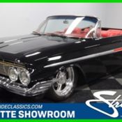 Award-worthy paint, custom A/C interior, four-wheel disc brakes, and a performance LS V8 under the hood â€" this 1961 Chevrolet Impala convertible is a stunning one-of-a-kind restomod that's so unique and powerful that it cannot escape the spotlight. You already know why the 1961 Impala is such a cool ride. There were some nice touches that did not make it onto any other year, and so they are sought after by collectors today. And because the convertible was one of the most expensive Chevys, it also is the rarest version today. But rarity is not what attracted you to this one. From the moment you lay eyes on it, you can tell it's full custom that was restored to have better precision gaps than even the factory could have made. Next comes the kind of deep black paint that you can understand how slick it is simply by how it radiates light even under our indoor lamps. The closer you get, the more luster and shine you pick up â€" there was some serious investment in getting it looking this amazing. This one has all the right bright work elements from the large wraparound bumpers, to the full-length sweeping trim that also gives a nice hint of the interior color. In the rear is one of the most intricate forms ever put to sheet metal. The dipping "V" is something so daring you could only get it in '61. The final step to making this a truly distinguished drop-top is the wheel package. Not only are the modern Billet Specialties wheels staggered 18/20 inches front/rear, but also you have an electronically controlled air ride suspension. So you can make sure to have the perfect lowered stance wherever you park. While the black folding roof fits sung, you know this was a car that was meant to be shared with the world. And with the touch of a button, it electronically stows away to reveal an aggressive and tasteful interior. This is a full custom red setup, but if you look closely, you can see some nice tributes to great Chevys. After all, the rear seats still carry the central logo that once housed the rear speaker; you still get the extra long speedometer; and the inserts in the seats and door panels pay tribute to legends like the '57 Bel Air. But everywhere else you look, this restomod offers plenty of modern upgrades. Those bucket seats have modern bolstering for all-day comfort, and in between them is a custom center console. This houses the controls for the air ride suspension and modern R134a air conditioning. It also houses the AM/FM/CD/DVD/XM touchscreen stereo with connections for Bluetooth and a full subwoofer stereo system. But even with all these goodies, it's the grip of the sports steering wheel and the stick shift that remind you this is a true driver's machine. As much as you'll love showing off the interior and exterior, it's the motor that will really draw all the crowds. Under the hood is modern 6.0-liter fuel-injected V8. It looks absolutely devilish with the full black presentation that's only broken up by the occasional red or polished component (just like the exterior.) And this modern LS powerhouse earns its aggressive presentation, because from the moment you fire it up, the grow of the dual exhaust lets you know there has been further investment in performance components. You are in complete control of this modern brute and its thunderous soundtrack thanks to the strong Muncie four-speed manual transmission. But just because this has beastly power doesn't mean it's hard to tame. Power steering, four-wheel disc brakes, and the modern grip of Nitto performance tires keep you in firm control. You're probably already imaging the places you can go and how fast you'll get there in this complete build. So hurry and give us a call before the best Impala around goes to someone else! Call now!