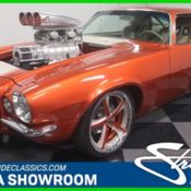 Sometimes too much is exactly what you need. That's the attitude behind this fantastic pro street 1970 Chevrolet Camaro. And before you say pro-street is dead, take a closer look, because this one is a very trick 21st century take on the familiar drag-race-inspired street car, and we like the results a whole lot. Anything painted Atomic Orange is going to get noticed, but with 18 inches of blower and air scoop hanging out of the hood, it will be impossible to ignore this Camaro. Building on the pro-street tradition of big horsepower, big tires, and big acceleration, it has raised the bar in terms of sophistication and design. Check out the smoothed body, which has no door handles, no mirrors, and no badges beyond the Z/28 emblem in the grille. The second-generation Camaro's body lends itself to the streamlined look, and with a custom aluminum wing neatly faired into the deck lid and painted to match (including the stripe!) it looks like a '30s aero streamliner as much as a blunt-force hammer for the street. There is a hood, of course, but it's mostly an opening for the blower. The cream-colored stripe is a great contrast against the copper paint and details like the crystal clear headlights, flush-mounted fuel filler on the deck lid, and '50s Pontiac blue-dot taillight lenses give it a trick look without losing its identity. The interior is combat-ready but still built for the street, thanks to comfortable tan bucket seats with provisions for harnesses, full carpets, and nicely finished door panels. No crude race car stuff here! A custom center console blends seamlessly with the fabricated dash, which is filled with Auto Meter Ultra-Lite gauges. The B&M shifter manages a TH400 3-speed automatic transmission and if you glance out the windshield, you'll see an extra pair of gauges for boost and fuel pressure mounted right to the back of the blower. Very cool! A 4-spoke Billet Specialties steering wheel has been wrapped in matching tan leather, giving the interior a consistent look. Yes, there's a cage, but it stays out of the way pretty well and the rear seat area is now full of wheel wells, so don't bother with any extra passengers. The trunk is all business, with a fuel cell mounted to the subframe as well as a remote-mounted battery. Don't worry, there's plenty of power to back up the outrageous look thanks to a built supercharged 454 cubic inch Chevy V8. That's a Littlefield 6-71 supercharger up top, fed by a pair of Holleys. Brodix aluminum heads improve the flow while reducing weight and there's a big enough cam to get noticed even at idle. It's pump gas friendly, so no worries about this being a cranky full-race piece and thanks to a giant radiator, electric fans, and an electric water pump, it keeps its cool. Don't get me wrong, it's nasty and not for a rookie, but it's also ready to use. There's a full A-arm front suspension with rack-and-pinion steering and coil-overs, and the custom 9-inch rear end uses a 5-link and coil-overs to plant those massive meats. A fabricated Flowmaster exhaust system sounds spectacular and uses flattened exhaust tips that look like they were borrowed from NASCAR. 4-wheel vented and cross-drilled disc brakes are there for safety and the stance is more pro-touring than pro-street. The same goes for the giant 19- and 20-inch wheels, which were color-matched to the bodywork and wrapped in 225/35/19 front and 345/30/20 rear performance rubber. This is a show car you can use on the street and it's got the hardware that tells everyone it's not fooling around. If you like to make a big entrance, few cars can do it better than this Camaro. Call today!