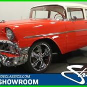 The mark of a true craftsman is how invisible he can make his work, and nowhere is that more evident than on this 1956 Chevy Bel Air. Despite its extensive mods the car remains instantly recognizable, and given the quality of the workmanship, you won't find many other shoebox Chevys that can stand next to it. At first glance, this car still looks like a '56 Chevy, right? Get a little closer, however, and you start to notice a lot of little tweaks, because there's not a single part on this car that hasn't been massaged, tweaked, and customized to make it one of the most spectacular machines we've ever featured. It's just gorgeous from any angle. The changes are seamless and work well with the other details like the shaved hood ornament and smooth deck lid, both of which kept the stylized 'V' emblem to emphasize the V8 power inside. Check out the way the bumpers tuck in ultra-close to the body and the beautifully rendered trim that looks simple but completely defines the car. The gorgeous gold over butterscotch paint job is subtle, sophisticated, and elegant and will never go out of style, making this a car that grabs your attention not by shouting, but rather by whispering to you in the most seductive voice possible. Paint and bodywork are just amazing and while we don't like to mention the word "perfect" around our showrooms, this car gets pretty darned close. Someone spent a ton of cash to make this car look so special. If you thought they'd phone it in on the interior, guess again. Featuring beautiful custom buckets, it's got a few traditional touches but a modern sensibility. Materials are top quality throughout and they were careful to make the door panels look like the originals. A custom center console houses a set of cup holders and auxiliary gauges that match those in the dash, and they're elegantly color-keyed to the rest of the car. The custom steering wheel looks a lot like the stock 1956 Chevy unit but has been painted bronze and gold to match the overall theme. Beautifully bound carpets feel plush and luxurious and it's been filled with all the luxury items from powerful A/C to power windows that glide up and down with a touch of the original handles to a powerful AM/FM/CD stereo system. It's clean, sleek, and very well finished so that you can't see where the stock stuff ends and the custom work begins, which is always the mark of a professional at work. Even the trunk is finished in such a way as to make you wonder if that's how they did it in 1956. Small block Chevy power is a given, with this car packing a modern tech LS2 V8 with fuel injection and all the modern upgrades. Custom engine covers painted to match the body make the LS powerplant look like it was born there, and with custom sheetmetal work throughout, the engine becomes a piece of art on a background rather than just a machine. Hidden plumbing and wiring keep it clean and many of the metal bits were painted to match the car rather than simply chromed. Other upgrades include a 4L60E 4-speed automatic transmission, power rack-and-pinion steering, 4-wheel vented and cross-drilled disc brakes, a custom stainless steel exhaust system with Magnaflow mufflers, and an A-arm suspension that's been lowered enough to give it that aggressive look. The underside is as detailed as the rest of the car, with body-colored frame, suspension, and brake components. The rear axle hangs on a 4-link suspension and the rolling stock is perfect, with 245/50/18s up front and 305/35/20s out back that really fill the fenders. Skillfully blending restoration and custom work isn't easy, but this awesome Bel Air delivers in every regard. We've never seen better and we're betting you haven't either. Call today!