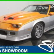 With show car looks, a turbocharged V6 from a Pontiac Turbo Pace Car, and a top that goes down, this 1987 Chevrolet Camaro Z/28 convertible does everything well. Exceptionally well built, it can probably still win trophies, but once you experience the thrill that comes with turbocharged performance, maybe putting it on the show field won't be a priority. The car was finished in 2005, but you'd never know it by looking at the stunning paint. It is Lamborghini Orange over Cadillac Silver, and the combination looks fantastic on the vintage F-body. Finish work is exemplary throughout, with show-quality work visible everywhere you look. Yes, those hood scoops are from a Trans Am, but they work rather well on the Camaro, don't you think? And the rest is standard Z/28, from the chin spoiler to the side skirts to the tall rear spoiler, all accentuated by that gorgeous paint job. The original emblems and badges were reinstalled, just in case you didn't recognize it, but despite the somewhat radical look, it's not that far removed from stock. The doors open and close easily, the urethane parts aren't cracked or damaged, and if we were really picking nits, the best we could do is one or two tiny nicks in the finish. Seriously, this is a spectacular car. Aside from the obvious 6-point roll cage, the interior remains largely stock, and that's a good thing. Check out those deeply bolstered Recaro bucket seats from a Trans Am Pace Car, complete with the cool mesh head rests, all upholstered in grippy cloth that keeps you pasted in place. A Turbo Trans Am also donated the trick steering wheel and instrument panel, although the white-faced gauges are a nice upgrade (and you'll note there is a boost gauge for the turbocharged engine, along with an aftermarket dial on the A-pillar). It's still loaded with options like power windows, a tilt wheel, A/C (needs to be serviced), and a recent AM/FM/CD stereo head unit that sounds good, top up or top down. The convertible top is a handsome black canvas piece that fits well and stows invisibly under a hard rear tonneau, giving the Camaro a sleek top-down look. The trunk is modest, with much of it occupied by a custom stereo setup with twin amplifiers and a big subwoofer. The heart of the car is a turbocharged 3.8 liter V6 that saw duty first in the Buick Grand National and later in the Pontiac Turbo Pace Car of 1989. They were modestly under-rated, but with a few choice upgrades, they can be some of the most formidable machines on the street. It's a neat swap into the Camaro's engine bay, and since the factory already did the engineering on the Turbo Trans Am, it's very OEM-looking. A few chrome dress-up parts reinforce the show car vibe and it retains all the factory controls, so it starts easily, idles well (if you're familiar with GM's V6 turbos, you know they're not perfect at idle), and pulls like a freight train out on the road. The 700R4 4-speed automatic transmission shifts crisply and allows the V6 to build boost quickly on the roll, and the Camaro's suspension didn't need any tweaking to handle the added power. It still has big disc brakes, fat stabilizer bars, and a torque arm rear suspension that really plants the rear end. 4-wheel disc brakes are standard equipment and the custom exhaust system sounds awesome, with a unique sound that turbo lovers will understand. Flashy chrome wheels add to the show car good looks and carry staggered 245/40/18 front and 255/35/20 rear performance radials. Beautifully built, very fast, and still fun to drive, this is a heck of a bargain at any price. You couldn't duplicate the paint and bodywork for the asking price, never mind the turbo motor upgrade. Call today!