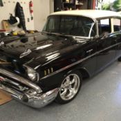 This is a "Gorgeous" 57 Chevy Bel Air 2 door post, painted a "Super Slick" Burgundy Metallic base coat clear coat sanded and wheeled smooth as glass, new weather stripping, new tinted windshield and side glass, back glass is original in good condition, new side view mirrors, new door handles, new grill and grill bar, new hood molding, new fender extension moldings, re-chromed front bumper, new tail light housings, rear bumper has also been re-chromed, side stainless is also new,... new emblems, rest of stainless is original in very good condition.Cool custom black diamond bucket seat interior, original dash, updated with 2 speed electric wipers, new Painless wiring through out, trio of gauges nicely mounted under dash, period correct tach nicely mounted on column, 3 spoke sport wheel, Lokar accelerator pedal assembly, headliner looks like new, updated with front bucket seats, original back seat - which all have been redone with custom diamond tuck - for a "COOL LOOK", door panels and rear panels have also been done to match seats, new window cranks and door handles, new arm rest, B & M performance floor shifter, new carpet with floor mats.Under the hood has been updated with a 350, mild cam, Edelbrock aluminum intake, Edelbrock carb with electric choke, Edelbrock signature aluminum valve covers, chrome breather, updated with electronic ignition, heavy duty radiator, this strong running 350 is backed up with a 350 turbo trans, factory exhaust manifolds into 2 1/2 inch dual Flowmaster exhaust out the back with stainless tips, updated with power front disc brakes, new front suspension - bushings, ball joints, springs, shocks, ect., factory type rear end with 355 gear, new shocks as well as new leaf springs.Rides on a set of SS Cragar wheels 15x7 front and 15x8 rear with 225/70/15 BF Goodrich TA Radials all around.This "Cool" 57 is ready to show and cruise.