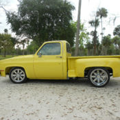 This Chevrolet C10 has an amazing stance and still maintains a good ride.The front is lowered approximately6" with dropped spindles and lowering springs. The rear is lowered about 8" with an axle flip and relocated forward spring mounts. The frame was "C" notched for additional clearance.