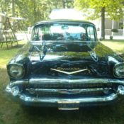 Exterior-Original 1957 color-onyx black, chrome is very good, new chrome bumper bullets, bumpers very good, Bel Air gold trim, trunk lid trim, new chrome hood bullets, antenna, glass is very good,4 original BF Goodrich wide white wall tires [2 new spares] approximately 2500 miles on them, original Belair wheel covers with spinners, fender skirts, new backup lights, trunk light, turn signals, new gas tank and float.