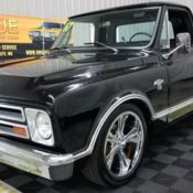 1963 Chevrolet K10 4x4 finished in black paint. This K10 has been lifted as well as having an aftermarket fiberglass cowl induction hood. Under the hood is a 454 V8 that is paired with a TH400 automatic transmission. This is also nicely equipped with power steering, power brakes, air conditioning, and a serpentine belt system. Nerf bars are also installed on this build. Riding on polished aluminum wheels and good tread. Nice garage-door esque tonneau cover installed that rolls up by the cab. The fuel tank has been moved to the inside of the bed of the truck just under the tonneau cover. Dual exhaust coming out the rear. Chrome and brightwork on this truck are in nice shape and shows well against the black paint. Black interior to match the exterior. Leather bucket seats with center flip down armrest. Carpeting, seats, door cards, and dash all in nice shape. Tilt steering, aftermarket gauges, and an aftermarket stereo installed. This truck does have a battery shut off on the battery as well. Great running and driving Chevrolet K10 4X4!