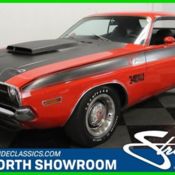Mopars are still grade-A investment muscle, and if you're going to park some cash in a car with a pedigree, we might suggest this 1970 Dodge Challenger R/T, complete with its numbers-matching 440 Six-Pack engine, 4-speed manual gearbox, and a ton of documentation. This car is the real deal. Subtle muscle cars with big engines are just plain nasty. While Chrysler was famous for their high-impact colors, nobody would see this cool dark green Challenger coming. It could hunt out in the open in 1970 and today it remains an extremely rare find, particularly in this condition. It is gorgeous and it stops people dead in their tracks and while we wouldn't say the paint is perfect, it definitely retains a great shine and finish throughout with only the smallest of imperfections. Panel gaps are very good and we like the fact that it's a "Stripes: Delete" car, adding to the car's subtlety. It does have hood pins, correct R/T badges, and those intimidating '440' emblems on the hood, so nobody's going to mistake this for grandma's grocery-getter, don't worry. It's also got the correct driver side outside mirror, nice chrome and good glass, so you can show and drive it with pride. If you're into rarity, this car totally nails it. We have to admit that the green interior works rather well and the industrial look of the 4-speed shifter (complete with pistol grip) coming out of the transmission tunnel suggests this car was built to do one thing only. Adding to the rarity, it is also a center console delete car, yet it does have a full set of Rallye gauges, including a correct factory tach, as well as the woodgrained wheel and dash inserts, which add a bit of upscale elegance to Dodge's premier pony car. It does have a replacement AM/FM radio that fits right were the original was, but otherwise, it carries nothing that will get in the way of going fast. It's all beautifully restored and nicely preserved, including the trunk which is filled with a correct mat and space-saver spare that appears to have never been used. The mill under the hood is the original, numbers-matching V-code 440 cubic inch V8 topped by a trio of 2-barrel carbs, known as the Six Pack. With 390 horsepower, it was second only to the Hemi, in terms of power, but if you talk to guys who were there, they'll probably admit that this car was probably unbeatable on the street. It's beautifully detailed with Hemi Orange paint, a correct air cleaner with decals, and factory cast iron exhaust manifolds. The block carries casting number 2536430-7, date code 6-5-69, and a correct partial VIN, which is also found on the transmission, cowl, and radiator support. It's the real deal. The 4-speed manual gearbox channels power back to a set of 4.10s in the Dana 60 rear end, and with that you know this is a Super Track Pak car and obviously built for combat. The undercarriage is spectacular, painted to match the body and nicely detailed with a new exhaust system, brake components, and shocks, suggesting that it hasn't been driven a whole lot since it was finished. It starts and runs extremely well, and if you're going to drive a Mopar, you'll be hard pressed to have more fun than in this Challenger. Correct Rallye wheels finish the look and are wrapped in staggered 235/60/15 front and 275/60/15 BFGoodrich T/A radials. Documented with Galen Govier paperwork, restoration photos, and other nice details, this is a pedigreed Challenger in a rare color combination that's 100% ready to rock. Call today!