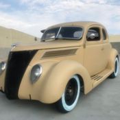 Rear suspension is 39 Ford spring with Pete and Jake's triangulated, adjustable bushed 4 bar. Front end is a genuine Mor Drop forged axle, new forged spindles and steering arms, Posie's Super Slide spring, 37 Bones, Ford F-1 shock mounts, Chassis Engineering shocks all around. 1937 Ford steering column.