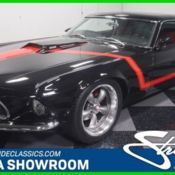 No need to adjust your monitor, there's nothing wrong; this 1969 Ford Mustang fastback really is that low. Professionally built to show standards, this Mustang is more than just radical, it's a runner! With a 428 Cobra Jet V8 up front, 4-wheel disc brakes, a 5-speed, and big wheels and tires, this is a pro-touring Mustang with a wild look that nobody will be able to duplicate. High-end customs like this rarely come to market, but if you want to stand out and get noticed, a pro build is a great way to do it. The roof was chopped two inches and sectioned three inches to give it that radically lowered profile, but it remains instantly identifiable as a Mustang. The astronomical amount of work required to build this car is visible everywhere you look, because without another Mustang next to it, it's hard to see where the modifications really took place. The fender flares still look right, the scoop in the quarter panel is intact, and while it looks even wider than stock, that part is just an illusion. Spectacular black paint is just the right choice to showcase the radical metalwork, and it's deep enough to prove that nobody was cutting corners on this build, because it's simply gorgeous. Red stripes are a riff on the Boss 302 and Mach 1 graphics, and all the factory stainless trim was trimmed, modified, and shaped to fit the altered windows. Out back there's a custom light bar for a taillight, the only part that doesn't quite look like it's from a Mustang. You could walk around this car for hours and not see all the tricks used to make it look like this. It's astounding. Don't worry, the interior is fully operational and comfortable enough for real-world use. The buckets are from a C3 Corvette, so they're the right size and shape for a low-slung car like this. The Mustang dash was subtly reworked and filled with beautiful Classic Instruments gauges in a carbon fiber panel and even the stock Mustang door panels were reworked to fit in the sectioned doors. Too cool! A 5-speed manual transmission has a cool carbon-fiber mini console and a pistol-grip knob and the three-spoke steering wheel is elegant. Full custom carpets, a powerful AM/FM/CD stereo system, cold A/C, and a few additional bits of carbon fiber make this a great place to hang out. It's strictly a 2-seater, with the former back seat area converted to a rather spacious storage shelf, while the trunk carries a spare tire assembly with matching cover. This Mustang remains 100% Ford thanks to a burly 428 Cobra Jet V8. It's tucked into the engine bay rather neatly, considering that they had three fewer inches of clearance under the hood. Wearing Ford Blue, it looks right, particularly with the oval air cleaner and finned valve covers for a vintage Ford performance feel. It isn't radical, but in this car, does it really need to be? It's reliable, powerful, and a lot of fun to drive thanks to the 5-speed manual gearbox and 4-wheel disc brakes. The front suspension is Mustang II with rack-and-pinion steering, so it feels modern, while the rear suspension is directly from a 2001 Mustang GT. It's amazing how smooth and composed this custom feels on the road. The custom exhaust system tucks up neatly to give it that pavement-hugging stance and it sits on 17-inch Coys alloy wheels that look giant only because of the radical body mods. Very few show cars drive as well as this one, and it looks spectacular. If you want to start winning the truly big trophies or just enjoy having the most radical car at any show you attend, this Mustang is the ticket. Call today!