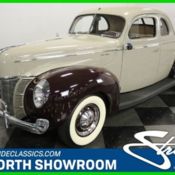 It's not often at all that you encounter a classic like this one. It combines what is believed to be just 28,421 original miles journeyed with a great looking exterior that's been kept in its original color scheme, and is in great operating condition to boot. This 1940 Ford Deluxe Coupe has such a powerful nostalgic effect that with a simple glance you're likely to find yourself transported back in time to an era when Sinatra was first wowing audiences with his vocal magic out in front of the Tommy Dorsey Orchestra, and the tune "Tuxedo Junction" was permeating the airwaves. Even decades back, Ford understood how big a part color played in a car's visual impact, and the original two-tone scheme on this Coupe, combining Sahara Sand over most of the body that's contrasted with Mandarin Maroon below, is clear evidence of that wisdom. A great deal of exacting care, as well as some good luck to protect it from collision and any permanent ravages of the elements, have resulted in its great condition, a state that made this classic a very worthy competitor on the local car show circuit. That ornate front grille separating this Deluxe model from its more commonly equipped stablemates sits level and unblemished, all of its exterior emblems are intact and well-positioned, and its extensive chrome trim is in unusually good condition, as well. With its wide set headlights surrounded by teardrop shaped casings and a high profile, prominent flat hood, and flowing fenders, it's a great example of how successful Ford was at creating an outstanding example of American luxury. You're sure to nod in admiration as you open the driver side door and climb inside. This is an impressively restored interior, and you'll find a very clean and well-padded cloth bench seat underneath you that's also been refurbished to original specifications. The attention to detail inside is obvious - the original instrument cluster in front of the stock steering wheel carries easily readable gauges, and even the knobs on the interior handles match the shade of beige featured on the dash area, which is also contrasted by the same shade of maroon as that of the exterior across the top. On the passenger side, you'll notice still another outstanding aesthetic feature in a car that's chock full of them - the art deco clock residing on the glove box door. This Ford's ample proportions and two-seat configuration make for a substantial amount of room in the trunk area in back, and that space is further maximized by the clever positioning of the full-size white-walled spare moored almost vertically toward the front. Not surprisingly, considering what you've encountered so far, a factory correct powerplant, in the form of a 221-cubic inch flathead V8, resides in the clean, tapered engine bay. It's carrying a single barrel carb on top - the standard in its day - and is running strong, mated with a 3-speed manual transmission that shifts with impressive precision. While the urge to display this classic is undeniably strong, its drivetrain is very much up to the task of real world motoring, and its drum brakes are capable of bringing this substantially sized Coupe to a stop quicker than you might expect. This unusually well-restored vintage Ford sits on a set of 15" era-correct stock Ford rims, outfitted with bias ply tires. Having benefited from a very sheltered existence and a lot of exacting care to bring it to its current impressive condition, this 1940 Ford Deluxe Coupe represents an opportunity you'll seldom find. Call today!