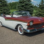 This 1957 Ford Fairlane 500 Sunliner is a fantastically coordinated total package inside and out that keeps all the right vintage pieces. And that's exactly what you want when shopping for a cool cruising V8 droptop classic. The appeal of this convertible is as clear as black and white â€" literally. While this was born a desirable black car, it was changed to a two tone later in life. That means the style appeal of a tuxedo and an extra dose of sunshine-friendly gloss. Plus, like the best formalwear, this Sunliner has all the best accessories. The correct hood ornament, extra-wide grille, and wraparound chrome bumpers are like the cufflinks and Rolex watch with this tuxedo. And we especially love how the sweeping side trim with gold insert gives a decisive dividing line between the two colors. Even the wheels look great as the whitewalls, black steelies, and chrome & white covers contribute to this fully coordinated package. The black convertible top has the crisp look of a recent investment, so it looks great when in place. But with the flip of a switch, it powers down to reveal even more of the two-tone you'll love. While the interior was born with a black and white presentation, you do see some more recent investments in places like the seats. Just like the exterior, the two colors are expertly blended, and supplemented by plenty of bright trim. And because all the best components have the look of originality, you're going to love showing this off to other enthusiasts. But more than just a car to look at, this is meant to share the open road with family and friends, too. That's the appeal of owning a premium full-size droptop classic. Tilt the hood forward to show off the correct-style D-code 312 cubic-inch V8. It was known as the "Thunderbird Special" in '57, and so those valve covers have been earned. It looks correct and distinct with the bold red block, large air topper, and even the washer bag. This one fires up readily, like a well-maintained classic should. And the Holley four-barrel carburetor gives the V8 proper power as well as help give the dual exhaust a nice tone. Plus, the two-speed automatic transmission, power steering, and modern tires all come together for a great classic cruising package. This is a nicely cared for classic, and there are even fender skirts and a car cover that come with the sale. This Ford looks like formalwear, and so you need to take it for a night on the town. Call today!!!
