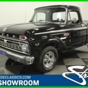 Big V8 power, a glossy presentation, and an obtainable price... you can read on for all details on this 1966 Ford F-100 Custom Cab, but you already know this is one hot deal. Ford did an amazing job in '66 with a bright chrome grille, little fender flare in the front, power dome hood, and a sweeping line of brightwork that runs from the front all the way down through the styleside bed. Painted a deep black with a modern clearcoat, this has stellar appearance when the sunlight hits it. Plus, there's an aerodynamic bed cover, side pipe exhaust, bright chrome bumpers, and iconic Crager SS wheels. So is this a pickup or a custom street rod? Well considering under the soft tonneau is a steel truck bed that's textured ready for a Home Deport Run, we'd say this truck looks like it's always ready for work AND play. Open the door and you'll find a bench seat covered in a cool red and black pattern that helps set the mood for the entire interior. The two-tone is also on the door panels and dash to continue this sporty attitude. In fact, with the racing seatbelts, sports steering wheel, and full Sunpro auxiliary gauge package (including large tach,) this has a truly competition-inspired atmosphere. But just because this is a performance pickup, doesn't mean you give up comfortable features. The Ididit tilt steering column, cup holders, and AM/FM/CD stereo let you know this is a truck that can be enjoyed anytime. You'll immediately spot your favorite upgrade the moment you see the engine bay. That 390 cubic-inch V8 looks great, and you know it's a big displacement because the valve covers announce it so well. The whole presentation is tidy and mean, and this V8 has the components to back it up. It's filled with go-fast goodies like a large Quick Fuel 750 CFM four-barrel carburetor, Edelbrock intake, and RV cam. Plus, you have the right supporting components like the Pertronix ignition and aluminum radiator. The long tube headers add even more power as they also contribute to the thunder of the 3-inch dual exhaust. Making sure this monster power gets to the ground is a TCI Street Fighter C6 three-speed automatic transmission. This feeds the 4.22 rear end for power takeoffs. You get a muscle car like power, and so that's why you also have upgrades like power steering, wide BF Goodrich T/As, and front disc brakes to easily keep it all under control. There are even new shocks and bushings to keep this performance pickup feeling crisp. Slick, powerful, and absolutely memorable â€" this is the custom truck you've always wanted. So don't let it go into someone else's garage. Call today!!!