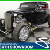 For all-out attitude and a super-traditional look, it's hard to beat this '32 Ford 3-window coupe. Stripped down to its bare essentials, it has the look of a pure street brawler, and if it could, it would probably have a pack of Lucky Strikes rolled up in its T-shirt sleeve. This looks like the car every hot-rodder of the '50s dreamed of building, but under the skin it packs 21st century technology that makes more sports car than vintage hot rod. The body is Gibbons fiberglass, not ancient steel patched back together, and until you've seen one of these high-quality reproductions, you can't imagine how well they fit together. Excellent gaps, a beautiful gel coat that has been properly prepped, and seamless finishing that makes it impossible to tell it apart from its steel counterparts. The unusual Niles Green paint is from the 1941 color chart and gives it a fantastic no nonsense look that is insanely appealing. A modest chop gives it a traditional look, and a three-piece hood with lots of louvers adds to the '50s vibe. Add in a nicely fitted top insert, the oversized commercial headlights, and 1950 Pontiac taillights, and it looks like this car might have been built in, say, 1954. No matter what you're driving, you're probably going to give this little Deuce coupe a lot of leeway on the road. In the 1950s, few hot-rodders could afford a fully finished interior, let alone the leather tuck-and-roll job inside this coupe, but this is no ordinary rod. The gorgeous green and white bench offers vastly more adjustability than the original piece, which means this car is all-day comfortable, even for taller drivers. Custom door panels were stitched up to match, and the dark green carpets are nicely bound and finished. There's a full complement of Stewart Warner gauges keeping an eye on the engine, all framed by a gorgeous engine-turned panel. Custom eyeball vents for the Vintage Air A/C system, a Lokar shifter, and an overhead console with an AM/FM/CD stereo all add to the high-quality feel and make this car a pleasure to drive. This coupe also includes a neatly finished trunk with plenty of room for your gear. There was no messing around when it came time to make horsepower: that's a fresh Summit Racing 350 cubic inch Chevy V8 that was built to run. Dressed in its own coat of black paint, there are a few tricks like the finned valve covers, OEM Chevy air cleaner, and an HEI ignition system. A 4-barrel carburetor is set up properly, so the car fires up quickly and runs superbly out on the open road and thanks to a thumper cam, it sounds suitably nasty. There's a big radiator up front and the owner reports that it doesn't get fussy, even on the hottest days with the A/C cranking. The transmission is a TH350 3-speed automatic feeding a GM 10-bolt with 3.08 gears inside, so it's relaxed at 70 MPH. Front disc brakes give this Ford impressive stopping power, and with a monochromatic paint job that gives the chassis a highly detailed look, it's a shame to take this little coupe off the lift. It achieves a traditional big-n-little look by using vintage artillery wheels with staggered Firestone bias-ply skinnies for a genuine old-school feel. Sure, you could build your own, but not for less than this, and you certainly can't duplicate this one's level of fit and finish for the price. Call today!