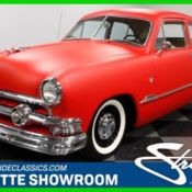 This 1951 Ford Custom two-door sedan is that perfect mix of vintage appeal with extra flair added in. So if you love flathead V8 power and a head-turning personality, then this is the obtainable classic you need to read all about. For the brief three years this design was available, the 1951 version is the final and often most sough-after. That's because of the bright work. Up front they doubled that amount of bullet-nosed boldness, and the cool wraparound taillight/tailfin was even longer. Speaking of wraparound, the bright side trim still retained the full-length sweeping effect, but now it followed the bodywork all the way around the rear. And this one has all the best classic style, right down to the factory wheel covers and whitewall tires. But what really attracts you to this is the paint. The satin red is a new and professional application, and in fact, the workshop shop owner is the one who had this vehicle. The matte finish gives this '51 Ford a hot-rod style attitude without being too outlandish - exactly why you want in an approachable classic. The exterior is fresh without losing its vintage appeal, and that same attitude is carried over into the interior. You can tell there was a nice investment in the tan seats, carpeting, and dash. Even the trunk has been thoughtfully updated. These two-door sedans have a nice profile on the outside while still offering a large back seat and rear vent windows, so it makes for a fine classic to invite others along for the ride. The big steering wheel feels great in your hands, and beyond that everything looks correct â€" from the large speedometer to the AM radio that's still on display. The glowing golden block of the 239 cubic-inch flathead is something we all love to see at car shows. You'll get an extra kick out of telling people that the date code on the block is period-correct. Plus, everything looks accurate â€" from the dual 90-degree radiator hoses to the big oil bath air cleaner. The correct single exhaust gives a nice hum, and the column-mounted three-speed manual transmission adds to the era '50s-style fun. All the right upgrades without jeopardizing the old-school fun. This '51 has a lot to offer for such an obtainable price. So don't miss out, call today!