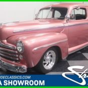 The quintessential fat-fendered rod, this 1947 Ford club coupe offers big car space, plenty of V8 power, and great details that make it stand out in a crowded field. There aren't many hot rods that can honestly be considered daily driver capable, but this one will make you want to slide behind the wheel every chance you get, even if only to join you on your morning commute to the office. Dressed in an appealing shade of metallic lavender, this awesome Ford has a familiar look that's never going to go out of style, but with a few custom touches that give it a unique look. The most obvious parts are the painted graphics on its flanks, but on a car that looks this good right out of the box, there's not much need to go overboard. The paint was probably done in the 1990s, yet it still looks good enough to hit the road, with the usual signs of use but nothing major. The sheetmetal is original and nothing was chopped or trimmed, and all the factory trim pieces were left in place, so it looks right from any angle. That means the beautiful wide grille, the stainless side trim, and even the window surrounds, all of which add contrast to the bright paint. There's a good amount of money spent on the brightwork and nothing looks out of place, even if you're a die-hard Ford enthusiast. The car just looks right. The attractive black cloth interior is why you'll find this car so appealing as a driver, with a no-nonsense look that blends original and updated components with ease. The upholstery work is neatly done and quite tasteful overall, with a pleated look that could come from the 1940s. The original speedometer, complete with red lettering, retains that 1940s sensibility, while the auxiliary gauges are modern white-faced dials hidden in the original openings. A tilt column with a leather-wrapped wheel make it feel more contemporary, it has all the amenities such as power windows, A/C, and an AM/FM/cassette head unit neatly installed in the center of the dash. The back seat is reasonably sized for full-sized adults, so it was appropriately upholstered to match, and there's a good-sized trunk which is simply finished with rubber mats, as original. It isn't a horsepower monster, but this good-looking Ford is ready to cruise thanks to a 350 cubic inch Chevy V8. an Edelbrock carburetor and Performer RPM intake manifold, HEI ignition system, and stock exhaust manifolds, it's a strong runner with a fat torque curve to get the big coupe up and running without working too hard. A chrome air cleaner and polished aluminum valve covers dress things up a bit and you could get big returns with an afternoon spent cleaning and buffing the engine bay. A big radiator keeps it cool even on hot days in traffic, and the block has been painted black to help it blend in. A TH350 3-speed automatic transmission and Ford 9-inch rear end mean it's friendly around town and on the highway. Standard exhaust manifolds and a custom dual exhaust system with original-style mufflers provides an old-school soundtrack and handsome aluminum wheels add to the subtle rake with staggered BFGoodrich T/A radials. Nicely maintained and obviously built to drive, this cool old Ford is a painless way to get a cool old car without spending a fortune. Call today!