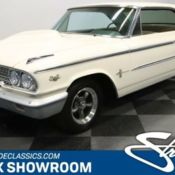 One of the best-looking two-door sedans of the '60s just got even better. Here's a 1964 Ford Fairlane 500 with some Thunderbolt style and plenty of power all its own. So check out all the investments made for a sleek look and serious V8 muscle. The upgrades to this two-door sedan are subtle at first. The wide chrome bumpers shine like mirrors, there's extra polish in the grille, and the full-length trim looks like an unbroken line on... the super-straight sides. But then you also spot unmistakable signs of performance like the teardrop bulge of the Thunderbolt hood and the wide pipes of the side exhaust. And while you're admiring the shine of the American Racing Salt Flat style wheels, you'll also notice how much wider the rear rubber is. And then there's the paint. It has the look of Ford's Vintage Burgundy, but there's a metallic element that really shows off under the sunlight. As an interesting side note, this is originally a Wimbledon White car. Those who know Thunderbolts are aware they only came in Vintage Burgundy and Wimbledon White, so this one really does represent the history in an interesting way! The interior has a great vintage attitude. Subtle racers are all about having two wide benches, and you can tell they made a nice investment to keep this gold vinyl look so retro cool. Plus, headliner, carpeting, and intricate door panels also received attention to give you a great atmosphere. In fact, this one feels authentic, right down to the AM radio that's still cranking out tunes! But what you'll really love is this one's Saturday night racer vibe. It comes from having the classic steering wheel and classic gauges supplemented by a full auxiliary readout trio and a large Sun Super Tach prominently mounted on top of the dash. The engine bay has a terrific tidy look. And pieces like the ribbed air topper, polished tower supports, and Ford Racing valve covers all look like they're radiating power within the darkness. And this lives up to the performance image with a 408 cubic-inch stroker V8. It has been enhanced with a Holley four-barrel carburetor, Edelbrock Super Victor intake, Edelbrock Performer RPM aluminum heads, and long tube headers feeding the side exhaust. You even have nice supporting components everywhere from newer gaskets throughout the motor to an aluminum radiator to help keep the V8 running cool. The undercarriage looks quite fresh and you've also got trusty components like Ford's C4 three-speed automatic transmission and 9-inch rear end. Plus, front disc brakes and BF Goodrich gForce tires are great for control. Bright, powerful, and distinct, this is the Fairlane of your dreams. So don't miss out, call today!