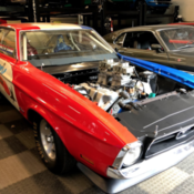 In late 1968 after returning from Vietnam, Andy Plym of Niles, Michigancaught the drag racing bug, and soon after purchased a Boss 302 Mustang. Having limited success he turned to Gapp and Roush Racing of Livonia, Michigan for advice. They suggested a 428 1970 Mustang coupe. This was the start of the Polaris Drag Team. Team members included Larry Mihaleil, Jerry Baker, Wayne Van Gilder, Bill Reeves, and Andy Plym. They went with a Red, White and Blue patriotic theme called the “American Wayâ€. Super stock racing was very successful to the Polaris Drag Team. So they decided to add a Pro Stock car to their efforts. With the expertise of Larry Mihalek and his connections with the Ford Drag Team, they selected a new 1971 Fastback Mustang. It was a plain Jane, Grabber Blue, 6 cylinder, 3-speed, sports roof, VIN 1F02L135858. The 1971 Mustang car was immediately cut apart at the dealership, and haulded to California for acid dipping. It was next taken to the Logghe Brothers Shop for tin, brakes and chassis work. They chose a Gapp and Roush raised port Boss 429 engine backed by a B&M clutch and a C6 transmission. These were all first for Pro Stock. A Dana 60 with 4:88 gear ratio was used. The body is currently restored to the same red, white, and blue Polaris Drag Team colors, including the unique red, white and blue interior – seats, door panels and carpet. This car was raced Nationwide along with the Super Stock car, winning many awards including the Best Appearing Crew Award in Indianapolis in 1972 and 1973. When the team disbanded after the 1973 season, the car was painted all red and raced in the Midwest until it was put in storage in the mid 80’s. Fast forward to 2012 when VIN 1F02L135858 received a rotisserierestoration on the original acid dipped body, which includes a fiberglass hood and deck lid, and it still retains the Logghe tin, brakes and chassis work. A Holman and Moody Boss 429 was topped with Gapp and Roush Raised Port Heads and matching tunnel Ram whichDynoed at 703 HP. All this is backed with an NOS B&M clutch which operates a C-6 transmission.
