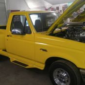 1994 Ford F-150 ROLLER This truck has no motor or transmission. It also has no fuel system or tanks. When i bought the truck it had a 351w in it with a 671 blower and c6 transmission. Also has a hole in the hood for the blower to fit.. all factory fuel system was taken out will have to run a carb and fuel cell. I was going to paint the truck with plastic dip paint to change the color and changed my mind. most of it is still on there and will have to use a heat gun to get it off or pressure washer like i have all ready done on the driver fender and door. I have a set of custom headlights in it that was $650. The lights Change colors and have to use the app on your phone to control the halos. the body on the truck is just about perfect shape. same as the interior . Also the a/c compressor is still hooked up. when you put a motor back in it the a/c still works as should.Has new wheels & tires on it . Has a radiator still in it with duel fans. also has a B&M floor shifter. Has a ford 9'' rear end. i have the driveshaft for it as well....If buyer wants i also have the 351w long block that came out of it and the c6 transmission with a couple different stall's I also have a set of Hooker headers and msd distributor . the 351w has 302 J heads roller lifters roller rockers & cam. motor is . 60 over with arp studs in the bottom end and arp head bolts. you will just need a water pump and intake. i would sell the motor and trans & all extra parts for 2500 extra. I also have a nice 1990 f150 roller if interested in buying them both. I am having a new home built and i have to sell my projects. I have this auction set as no reserve . THE LAST PHOTO IS HOW IT WILL LOOK WHEN THE PLASTIC DIP IS TAKEN OFF.