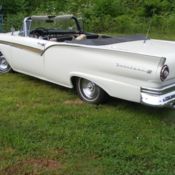 1957 Ford Fairlane 500 Convertible finished in Colonial White. Black and white vinyl bench seat interior, shows its age. This was repainted in 2004, engine was rebuilt in 2003. This is a frame-on restoration. 312 V8 that is paired with an automatic transmission. Chrome and brightwork appears to be original throughout. Interior appears to be original. Continental kit installed on the rear. Convertible top does go up but needs help halfway up and down. Top has been replaced along the line.