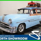 When it comes to sheer head turning ability, it's a small and select group of classic cars that's anywhere near the same zip code as this 1954 Pontiac Chieftain Station Wagon. But whereas you'll find most of them at their best at a standstill on display mode, this roomy vintage cruiser is also very road-ready. It's armed with a powerful drivetrain and a host of top-quality components, so the fun behind the wheel can begin just as soon as you get it home. Just one look at this classic station wagon, dressed in its tranquil blue color and sporting the Tin Woody look from prior years, you'll find yourself starting to relax and daydream about memorable road trips and great weekend journeys. It's long and broad, with generous vertical space under its roof so it's easy to picture yourself inside, with a group of close friends or family in tow, having the time of your lives as you set about an adventure. There's a great array of chrome on display here - the front end is a show-stopper, with its beefy front bumper and grille combining with a broad swath of chrome on the front of the hood to create a look all its own. It's also a reassuringly solid classic - its doors open and shut smoothly and if you give a tap on one of the fenders, you'll get that unmistakable sound to let you know that sturdy steel sits underneath the paint. The roof rack on top along with the wood panel look (a very sharp wrap) sets an appropriate theme - while there's so much space inside you may not need to store much above, this Pontiac is ready to load up and go. The interior has an era-appropriate yet vital look to it, with two-tone, blue and white vinyl bench seats in front and back with sofa-like dimensions that have plenty of padding to ensure comfort on even the longest of road trips. The dash area just in front of the blue metallic steering wheel sitting on its tilt column is a definite conversation piece unto itself, with a few updated touches taking their place alongside thoroughly vintage features - the fan-shaped speedometer and concentric rings framing the clock at its center are standouts. Underdash vents indicate that there's air conditioning on board, and it's running strong and cold - every bit a match for the warmer weather ahead. The vintage-looking Chieftain AM radio adds still more nostalgic cachet to the interior, while an AM/FM/CD player with auxiliary and USB ports sits waiting in the glove box to provide more modern audio options. Even with those two rows of seats, there's some substantial storage space in back - it's in nice condition and lined with clean blue carpeting. Itching to get on the road? No problem here. There's a 350 cubic inch crate engine under the hood, topped with a Holley 4-barrel carb under its distinctively etched air cleaner, and it's only logged about 19,000 miles, so it's in great form, sounding a nice deep note into its headers leading out to its Flowmaster dual exhaust. It sits in a nice, tidy compartment, with plenty of space on its sides, with its surrounding hoses and wiring looking fresh. It pairs with a rock-solid 3-speed automatic transmission for a low-effort but dependable driving experience that will take the monotonous clutch work of stop and go driving out of the equation. Power steering makes navigating this sizable classic an easy undertaking and power brakes at all four corners, with discs in front, bring it to prompt stops as needed when it cruises highway and boulevard alike on its 15" American Racing polished aluminum wheels, outfitted with Marshall Touring A/S tires. With its off the charts nostalgic appeal, spacious interior and powerful drivetrain, this 1954 Pontiac would be a great score for the fun-loving classic car enthusiast. Call today!