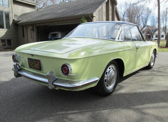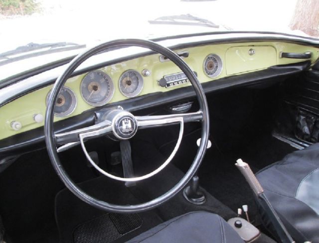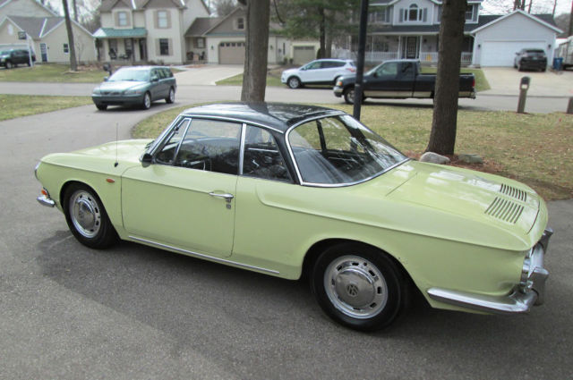 This is a 1966 Type-34 Razor Edge Karmann Ghia. Matching Numbers, a pretty original and complete Car. Finished in her factory L560 Manila Yellow, with black roof over the original black interior.